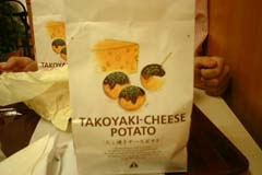 | それで最初に立ち寄ったのは、なぜか・・・というよりやっぱり日本橋の電気街だったりする(爆)。 夜行列車に揺られヘロヘロ状態の二人がふらりと休憩に立ち寄ったのがファーストキッチン。そこの店員に執拗に薦められて買ってしまったのが「たこ焼きチーズポテト」なんだけど、はっきりいってダメダメだよ・・・。たこ焼きとかいいつつ、スナック菓子の「たこ焼き味」じゃねえか! その後、庄屋さんが秋葉原で働いているお店にお土産を持って行き、今回は衝動買いをするというアクシデントもなく無事に日本橋を去ることができたよ。 |