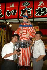 予定より1時間も早く出発したのにも関わらず、電車が無いというトラブルから大阪に着いたのは結局18:28と、予定通りの電車になってしまったよ。 庄屋さんは親戚の家へ行くために大阪駅で別れを告げ、難波でコテコテの関西人ことIsao!さんと大蒜さんと合流することができました。 道頓堀を通りつつ、くいだおれで飯を食い、たこ焼きやで2皿もたいらげ、難波駅の551でアイスを食べ・・・。う〜ん、短時間にもかかわらず有名どころをかなり回ることができましたよ〜。本当に感謝感謝です!! |