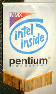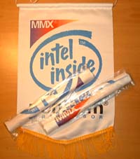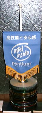 こちらも某パソコンショップの店員さんから頂いてきたMMXペンティアムの旗。当時はこれが最新だったので秋葉原に行くとそこら中にぶら下がっていたものです。これは上の竿付きのものに比べるとかなり大型で、それとなく格好いい・・・かな?(笑) ・・・なぜがスペアが3つもあるし(爆) |